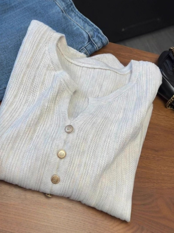 Дамски плетен топ с V-образно деколте, корейски стил, дълги ръкави, за слоево обличане, от вискоза