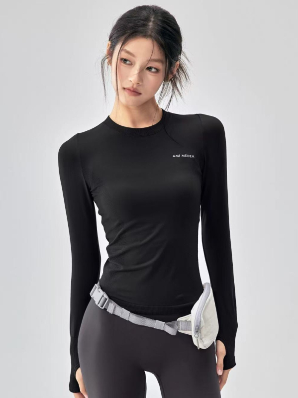 Дамски топ за йога с дълъг ръкав – силуетен, с висока еластичност, тъкан найлон-еластан, 95% найлон, 5% еластан, дължина до ханша, подходящ за фитнес и бягане