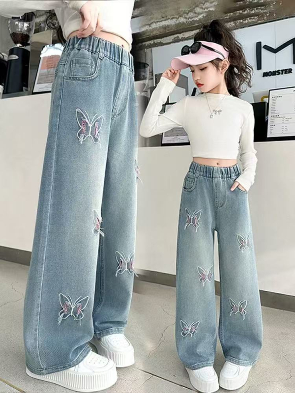 Дънки за момичета с прав крак, памучен деним, меко ензимно пране, средна талия с еластичен колан