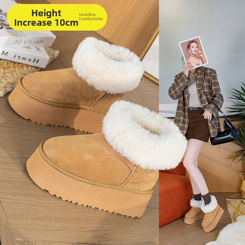 Зимни ботуши със платформа за ниски дами, средно високи до под прасец, вътрешно повдигане 10 см, горна част велур от говеждо (nubuk), подплата от изкуствен пух, подметка от пяна гума, противохлъзгащи.