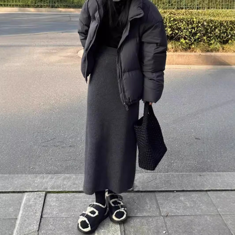 Плетена пола с А-образна линия до миди, висока талия, микроеластична, акрил 30–50%, полиестер под 30%, едноцветен модел, ежедневен японско-корейски стил