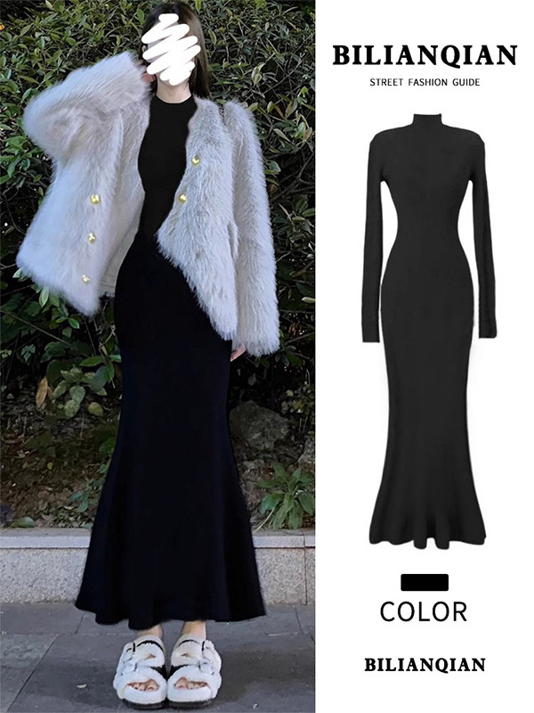 Фиштайл Чиангсам рокля, смес вискоза и полиестер, полувисока яка, дълги ръкави, еластична талия